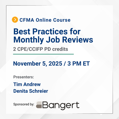 Consistent and disciplined monthly job reviews are critical to maintaining the profitability of a construction company. Learn how to monitor financial health and project progress, identify potential issues, and make informed decisions to ensure that projects stay within budget and on track. This interactive course will showcase how the best-managed construction companies conduct this vital process.